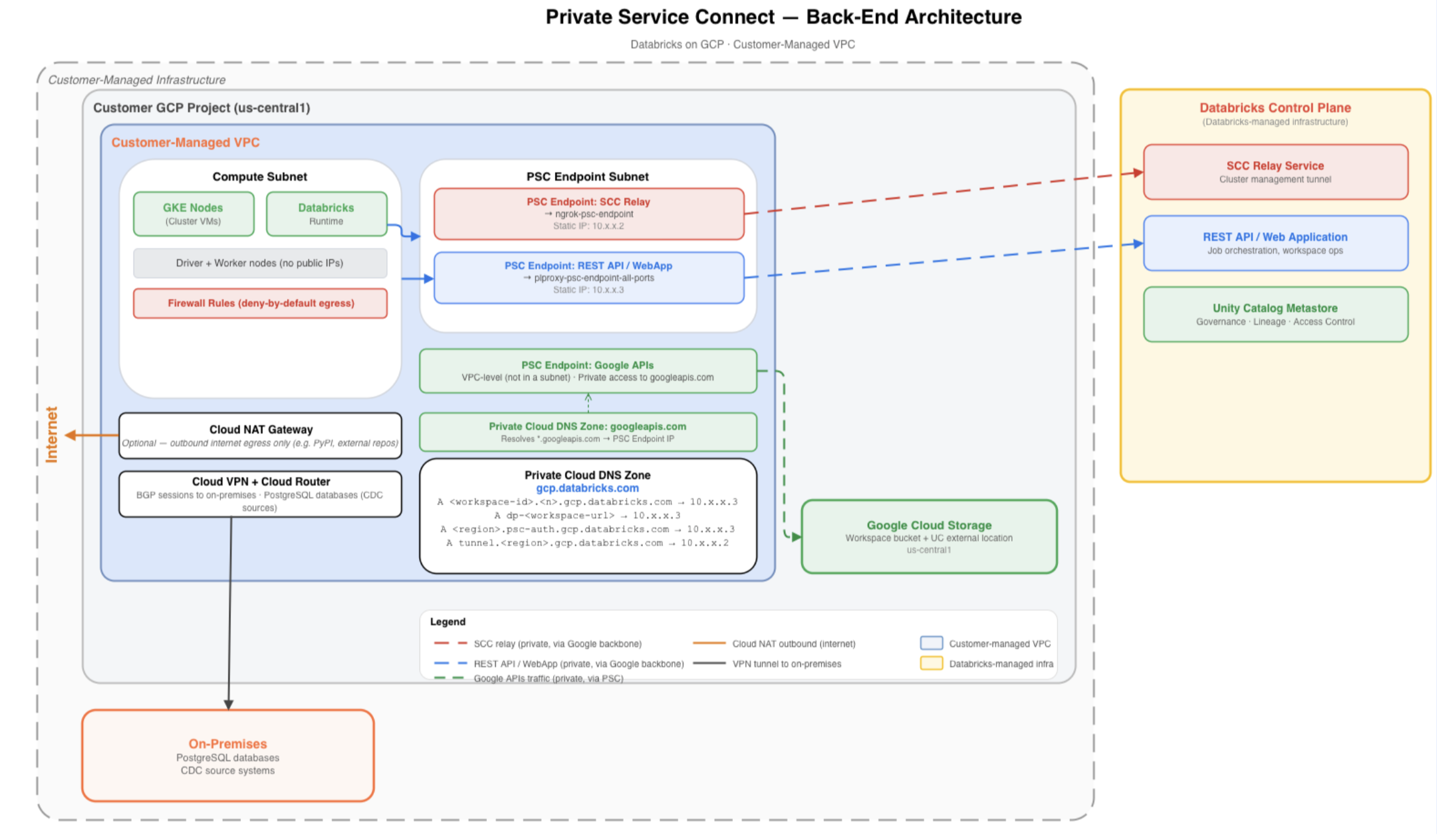 Cluster outbound traffic to the control plane resolves through a private Cloud DNS zone and is directed to the appropriate PSC endpoints. These endpoints connect to Databricks-published service attachments, allowing traffic to flow privately over Google's backbone network to the Databricks control plane shown on the right.