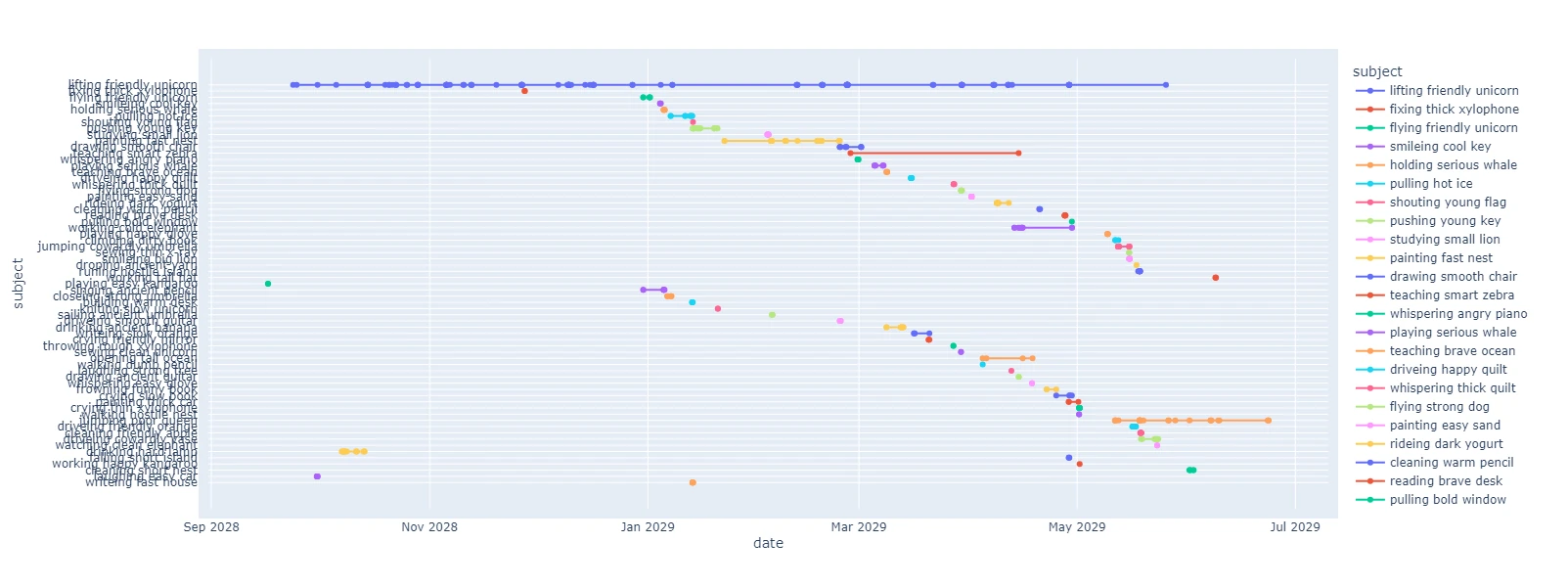 fig = px.line(df, x="date", y="subject", color="subject", markers=True)