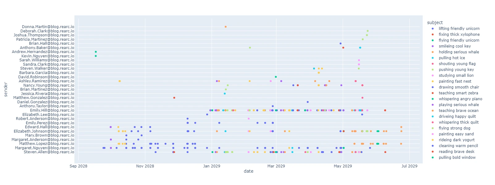 First, let’s see what a scatter plot of senders by date and subject looks like. This is useful to get an idea of who is responsible for most of this email, and when.